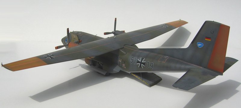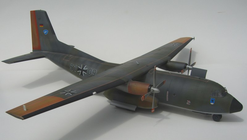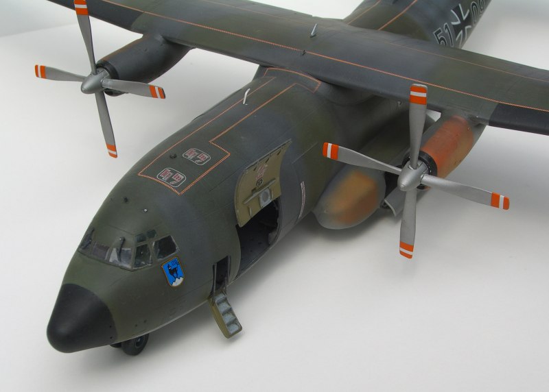 Bausatz: Revell hat 2006, 43 Jahre nach dem Erstflug dieser Erfolgsmaschinen, auch einen reich detaillierten Bausatz der C-160 in 1:72 vorgestellt. Wie lässt sich das relativ große Modell nun zusammenbauen? Eigentlich recht gut, wenn man einige Regeln beachtet werden, die da sind: Viel Geduld insbesondere bei den Kleinteilen, der Inneneinrichtung und deren Bemalung und beim Einpassen dieser Baugruppe in die beiden Rumpfschalen. Dabei sollten die Fensteröffnungen des Frachtmoduls genau mit denen des Außenrumpfs übereinstimmen. Sitzt alles 100%ig in den Aussparungen, lässt sich der Rumpf ziemlich passgenau zusammenfügen. Auch dem Fahrwerk hat sich Revell besonders gewidmet. Die Räder sind nicht einfach zwischen Rumpf und Radkästen zu klemmen, sondern hier sind die Schutzverkleidungen mit ihren Federungen und Stoßdämpfern einzubauen und alles wird von einem sehr filigranen Gestänge gehalten, wobei aber auch ersichtlich wird, wo das Material Plastik an seine Grenzen stößt. So bewährte sich, ein Schaumgummistück zurechtzuschneiden und dieses zwischen Rumpf und Tischplatte zu legen, denn die Räder sollten bis zur Aushärtung des Klebers leicht ausstehen, damit sie in der richtigen Position bleiben. Wenn mit Sekundenkleber gearbeitet wird, sollte eine langsam aushärtende Sorte benutzt werden, denn sind die Verstrebungen zu schnell fixiert, droht beim geringsten Nachjustieren Bruch. Erst jetzt sollte man sich dem Bugrad widmen und das Ganze dann mit dem Hauptfahrwerk in die Waagerechte bringen. Dabei könnte es sein, dass das relativ kurze Bugfahrwerk in seinem Schacht höher gesetzt werden muss.