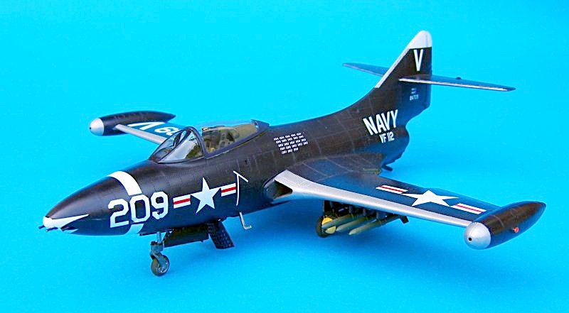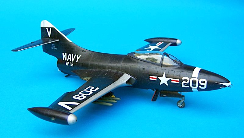 Die Unterflügelbewaffnung entspricht dem Standard des im Koreakrieg hauptsächlich von Flugzeugträgern eingesetzten Jagdbombers. Wer möchte, der kann seine Panther mit hochgeklappten Tragflächen darstellen. Die Decals für drei Maschinen der US Navy (mit weißen und roten Markierungen) sind von guter Qualität. Allerdings ist der vordere weiße Bugstreifen einteilig gedruckt und muss auf Höfe der Nullziffer oben und unten passend zugeschnitten werden.