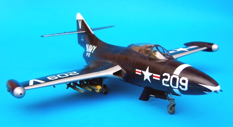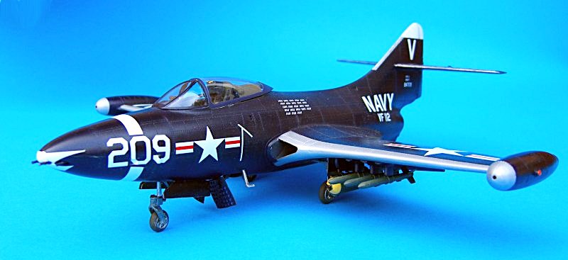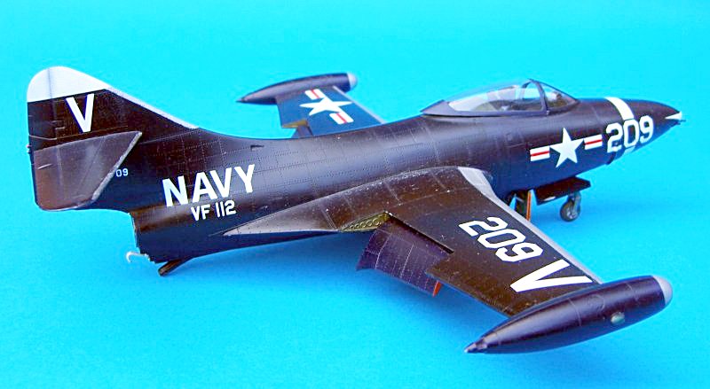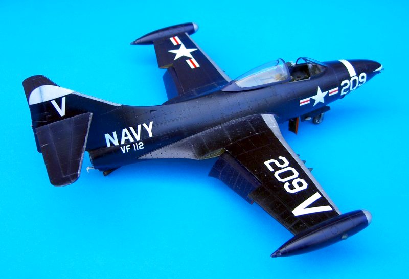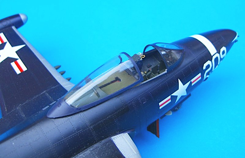 Bau: Gegenstand dieses Bauberichtes ist die Jagdbomberversion F9F-2. Das erste was einem bei den rund 120 Bauteilen auffällt, sind die markanten Nietenstrukturen auf Rumpf und Tragflächen. Nach dem fertigen, einheitlichen Anstrich in glänzend Schwarzblau aber, verlieren sich diese weitgehend. Der einfache Aufbau der gesamten Komponenten, sowie die angenehm gute Passung (besonders die V-förmigen Lufteinläufe zwischen Rumpf und Tragflächen schmiegen sich hervorragend an die Außenhaut an), machen das insgesamt gut detaillierte Modell so richtig einsteigerfreundlich. Lediglich das Cockpit wirkt etwas simpel. So vermisst man die von TRUMPETER in letzter Zeit oft beigefügten Ätzteilgurte, welche auch dargestellte Schleudersitze aufwerten.