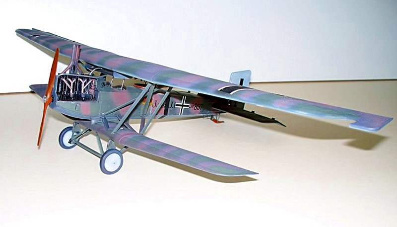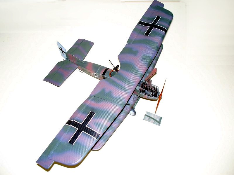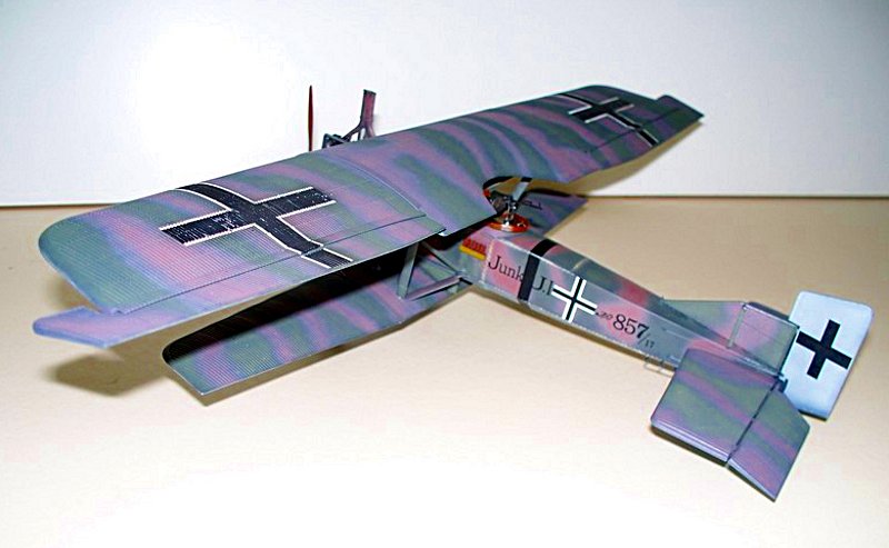 Die Bauanleitung geht sehr präzise auf die zeitgenössische Farbgebung der Flugzeuge ein. So dürfte die Vorgabe Graugrün über alles mit Hellblauen Unterseiten und einer Fleckentarnung in Flieder/Violett durchaus historisch korrekt sein. Die Decals reagieren gleich gut auf herkömmliche Weichmacher wie Set und Sol bzw. Marker Softer von Gunze. Allerdings sind die großen Kreuze auf den Tragflächen schwer der Wellblechstuktur anzupassen. Hier muß gegebenenfalls mit etwas Trickserei, z.B. einritzen mit einem Skalpell nachgeholfen werden. Anschließend ist ein Mattlacküberzug notwendig weil die Kennungen glänzend ausgeführt sind.