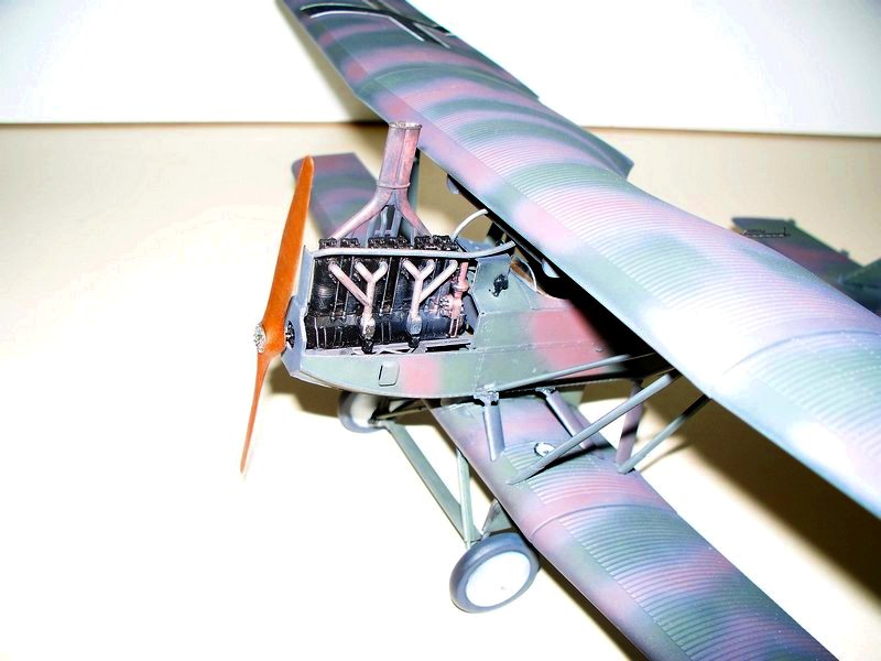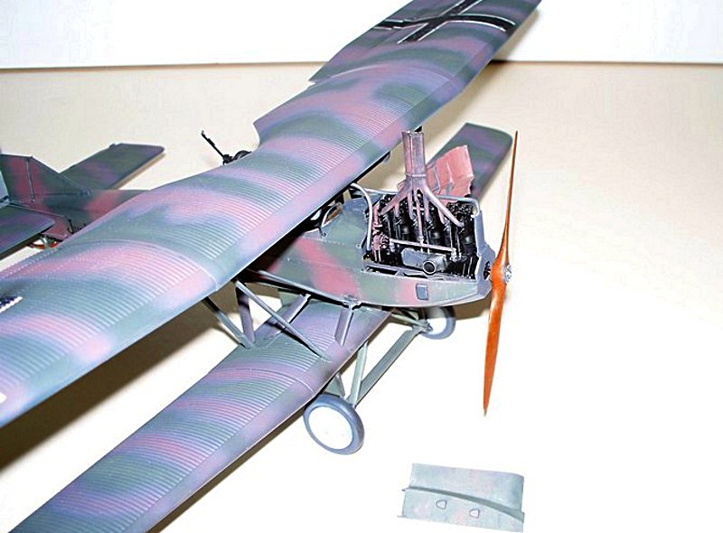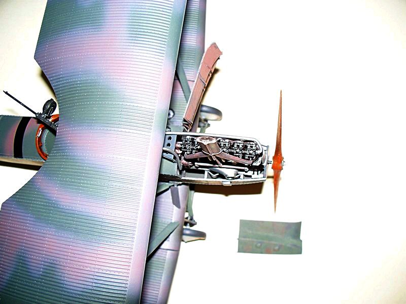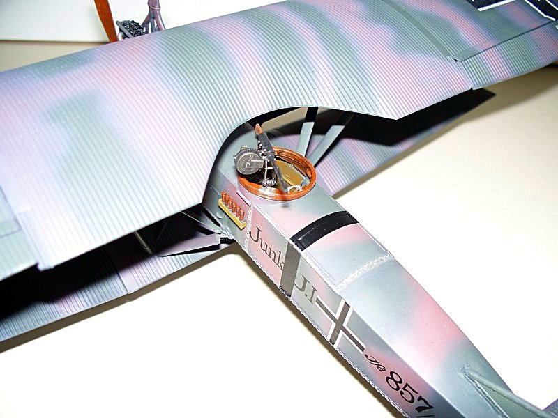 Der Daimler Benz Bz IV Motor ist als Modell einfach aber gut gestaltet. Zu kritisieren wären die nur angeprägten Stößelstangen an den Zylindern. Der markante Kaminauspuff wurde oben mit einem spitzen Skalpell aufgeschabt. Drei Löcher anbohren und an den Rändern entlang aushöhlen. Das macht sich anhand des nicht zu spröden Materials recht gut. Alle Streben, auch die des Fahrwerkes wurden mit Sekundenkleber Gel befestigt. Das gibt den Großen Teilen die nötige Festigkeit und Stabilität, denn das Modell ist aufgrund seiner Fertigung ein Schwergewicht. Nun noch den Drehkranz mit dem Varianten spezifischen MG zusammengebaut und fertig ist unsere Junkers mit ihrer außergewöhnlichen Silhouette.