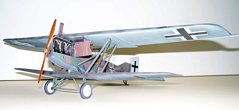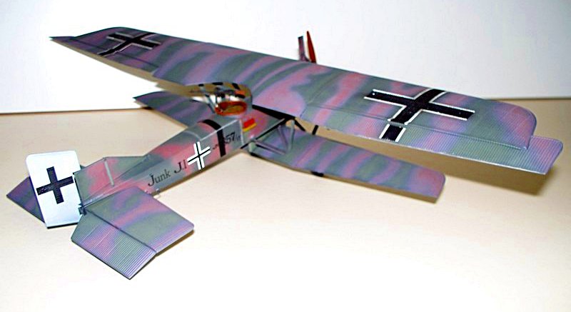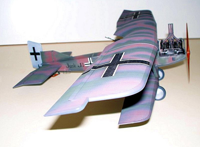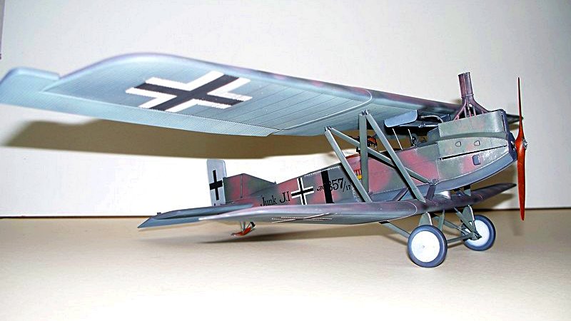 Die J-1/J-4 war aus Dural-Aluminium im Wellblechverfahren gefertigt und der vordere Rumpf bekam eine 5mm Stahlpanzerung zum Schutz der Besatzung und des Motors gegen Bodenbeschuss. Frühere Muster, wie auch unser Modell darstellt, hatten noch einen stoffbespannten Hinterrumpf. Trotz ihres schwerfälligen Aussehens und ihrer Größe war die Maschine wohl gut zu fliegen. Allerdings wurde eine lange Start- und Landebahn benötigt um sie in die Luft und wieder herunter zu bekommen. Die markante Wellblechstruktur der Junkersflugzeuge wurde bis spät in die 30er Jahre das Markenzeichen dieses genialen Konstrukteurs.