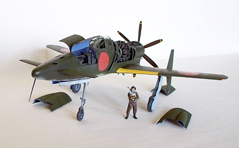 Tatsächlich aber begannen die Arbeiten an den ungewöhnlichen Flugzeug schon im Jahre 1944 und im Juni des darauf folgenden Jahres hatte der erste Prototyp sein Roll- out aus den Werkhallen der Kyushu Hikokai KK company. Der im hinteren Rumpf eingbaute18 Zylindern Mitsubishi MK9D Sternmotor und die mächtige Druckluftschraube mit ihren sechs Propellerblättern sollten der Shinden(Blitz) eine Höchstgeschwindigkeit von ungefähr 750 Km/h geben. Das, und die zur damaligen Zeit völlig neuartige Zellenkonstruktion mit den vorderen Canard-Flügeln, welche der Maschine eine enorme Wendigkeit und Steigfähigkeit gegeben hätte, sollte ein letztes Aufbegehren gegen die Flut der amerikanischen schweren Langstreckenbomber vom Typ B-29 möglich machen.