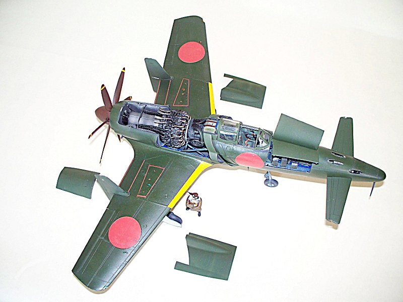 Tamiya Acrylfarben Japanese Navy Green sowie Navy Gray liefern die richtigen Farbtöne. Auch die Verarbeitung der selbigen ist problemlos und deckend. Für das Cockpit wurde Grüngrau von Revell Aqua verwendet. Für innere Bereiche, also Fahrwerksschächte, Landklappen usw. mischte ich mir mit Ultramarinblau, Weiß und Silber das sogenannte Aotake-Blau an, welches die Japaner oft als Schutzanstrich gegen Korrosion verwendeten. Für die Hinomarus, also die roten Sonnenzeichen der japanischen Hoheitsembleme wurden die beiliegenden Decals verwendet. Diese sind ganz Okay reagieren gut auf herkömmlichen Weichmacher und der Trägerfilm bleibt unsichtbar.