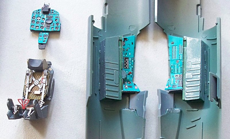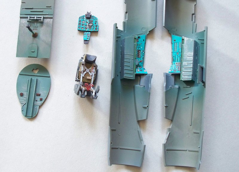 Der geneigte Modellbauer hat nur noch die Aufgabe, die rund 370 Einzelteile zusammenzufügen, welche das Modell dieses klassischen Düsenjägers erfordert. Dabei ist das Wichtigste, die Übersicht über die einzelnen Arbeitsschritte zu behalten. Denn der Spachtel hat nur in ganz kleinen Rahmen seinen Auftritt. Dieser beschränkt sich dann, den ein wenig im Durchmesser zu klein produzierten vorderen Ringkonus dem Rumpf anzupassen. Für winzige Unebenheiten beim zusammenfügen der Rumpfhälften, genügt es den Restkleber zu verschleifen. Tragflächen, sowie die große obere Rumpfverkleidung passen sich nahtlos an ihren Klebepunkten an. Das schont unsere Nerven und vor allem die Gravuren.
