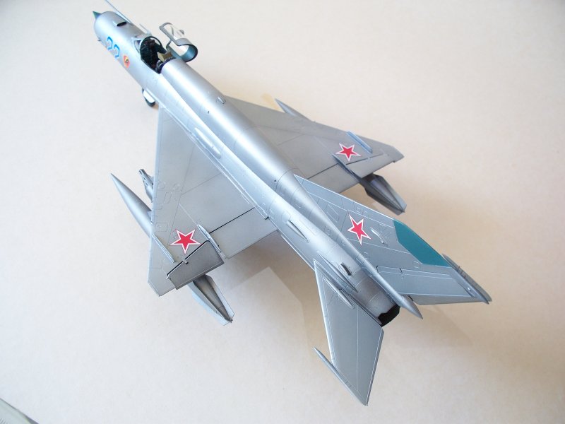 Nun kommt die Qual der Wahl, welchen Anstrich das Modell bekommen soll. Da sich der Bausatz der Mig 21 SMT widmet, also einer Maschine mit einem nochmals gegenüber der Mig 21 bis oder MF vergrößerten oberen Rumpfwulst zur Aufnahme von noch mehr Treibstoff, sollte man wissen, das diese Flugzeuge nur in der Sowjetunion flogen. Zur Auswahl stehen nun drei Migs in Tarnfarben und zwei Varianten in Aluminium.Meine Wahl fiel auf die Maschine mit dem Lenin-Wappen am Bug. Und es reizte mich, mal ein Modell mit Alu-Anstrich zu versehen. Das wichtigst dabei ist, dass die Oberfläche völlig glatt und homogen sein muss. Der Silberanstrich, gerade mit der Air-Brush gestaltet, verzeiht nicht den geringsten Staubpartikel oder gar Schrammen. Auf dem Original dieser Maschine wurden übrigens Piloten befreundeter Länder aus dem afrikanischen Raum, z.B. Angola, sowie Staaten aus Süd-Ost Asien geschult. Der Wunsch, diese Variante der Mig 21 an die jeweiligen Ländern auch zu verkaufen, ging aber nicht in Erfüllung. Die externe Ausrüstung der Bewaffnung musste ich aber etwas ändern. Für die dem Vorbild entsprechenden FAB 100 Bomben fehlten mir drei von den hinteren Stabilisierungsringen.