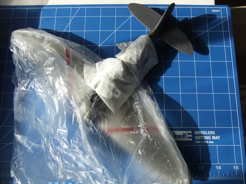 Das rote Heckteil zwang das Modell nun erst einmal in eine Mülltüte, um die vorige mühsame Arbeit vor feinem roten Farbnebel zu schützen. Danach wurden alle metallisch lackierten Abschnitte mit einer Lage "Future" überzogen. Nun werden die wenigen Decals angebracht, unter anderem natürlich die japanischen Sonnenzeichen (Hinomaru). Zum Schluss wird die "Claude" mit dem vorbereiteten Motor, dem 160 Liter Tank, und den Fahrwerken ausgerüstet.