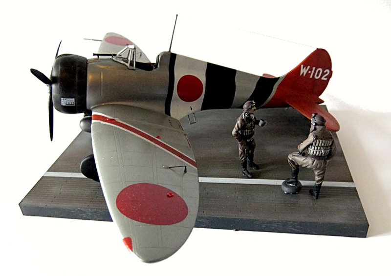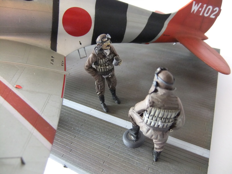 Die Windschutzscheibe, die Antenne, der Propeller für den eine Achse angefertigt werden muss, sowie die Aufhängung für die Bomben vervollständigen das Modell. Dieses platzierte ich auf einer Vignette der Fa. Eduard, einem Ausschnitt japanischer Trägerdecks dieser Periode, und zwei passende Figuren kaiserlich,japanischer Marinepiloten aus dem CMK-Sortiment wurden noch hinzugefügt.