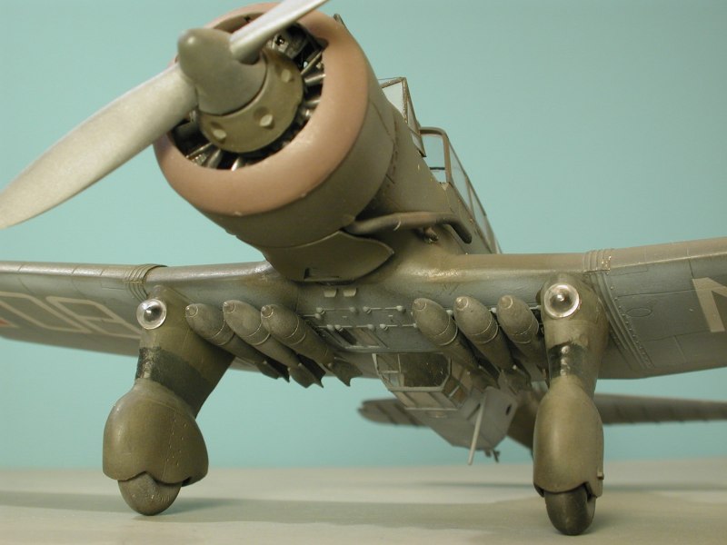 Die Kanzelverglasung ist etwas spröde und neigt somit bei zu viel Belastung zum Splittern. Also Vorsicht bei Abtrenn- und Maskierungsarbeiten. Wichtig wäre es noch zu erwähnen, dass die seitlich am Rumpf sitzenden Prägungen zum Aufbohren der Löcher zur Befestigung der Auspuffanlagen kaum zu erkennen sind. Am Besten gegen das Licht halten und vor dem Bohren mit einem Stift markieren. Zu den Resinteilen gehören auch die sechs lanzenförmigen 100 kg-Bomben, welche bei dieser Maschine verwendet wurden. Leider ist deren Abguss nicht gerade der Hit und insbesondere die dünnen Leitflächen sollten gegebenenfalls mit Plastic-Sheet gesondert angefertigt werden.