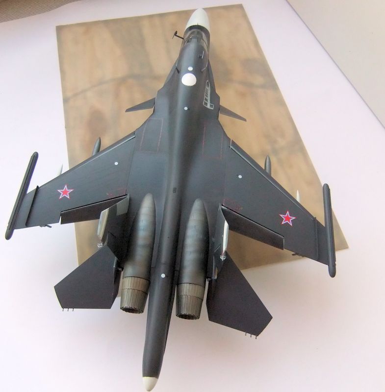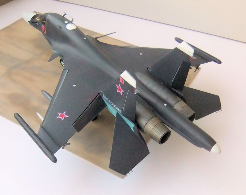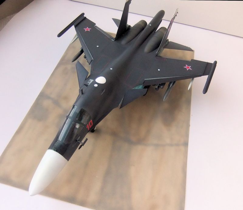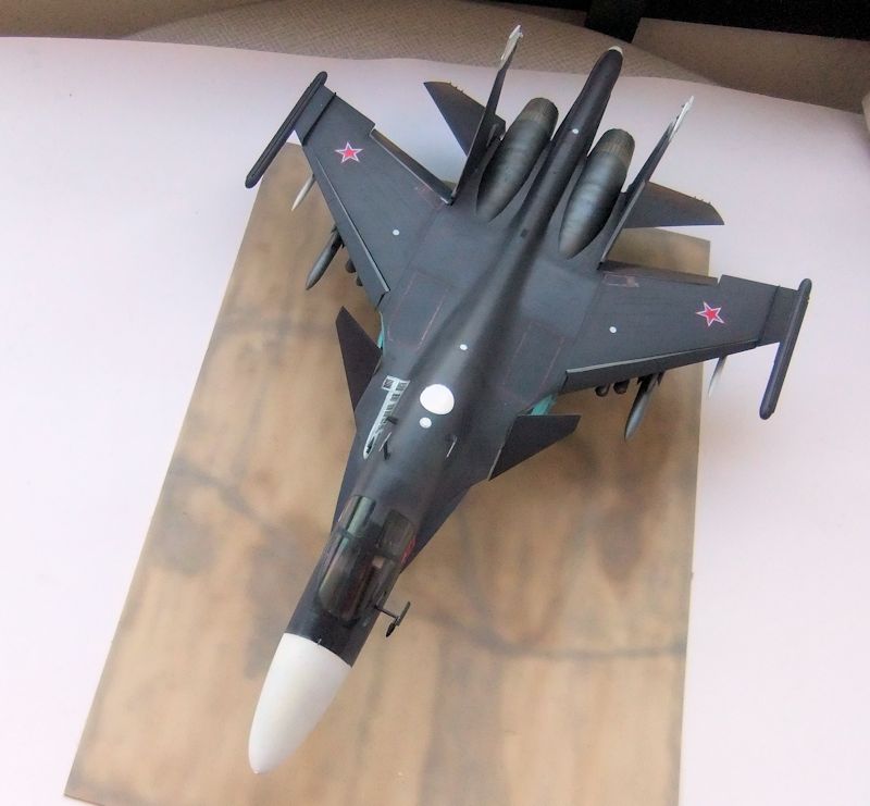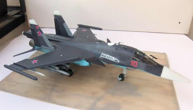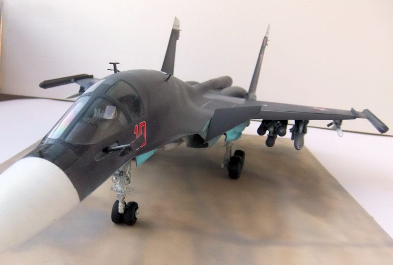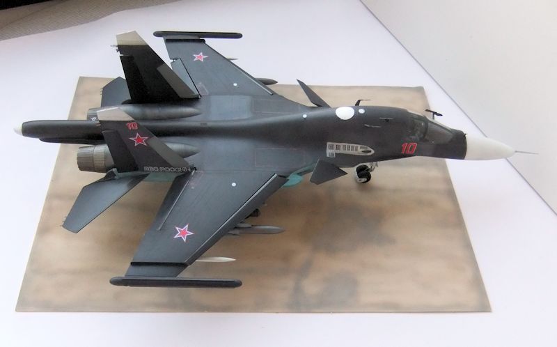 Als nächstes werden die Nachbrenner verarbeitet, farbig gestaltet, unter anderen durch die Trockenmalmethode, und in ihren Verkleidungen eingesetzt. Die Bausatzdetails sind recht gut ausgeformt, so dass ich auf Nachrüstung verzichtete. Es gibt sicher noch andere Modelle die es nötiger haben. Nun werden an den Flügeln die Landeklappen und die Vorflügel in abgesenkter bzw. ausgefahrener Position befestigt gefolgt von der von mir vorgesehen Bewaffnung. Dazu gehört auch der große PTB-3000 Zusatztank unter dem Rumpf. Nun werden die beiden Leitwerke eingesetzt. Erst die Leitwerke, dann die Landeklappen!! Zum Schluss kümmerte ich mich noch um die Höhenruder und die Canardflügel. Stecken reicht aus. Außerdem wurde die Su-34 noch mit ihren Antennen und Staurohren versehen.