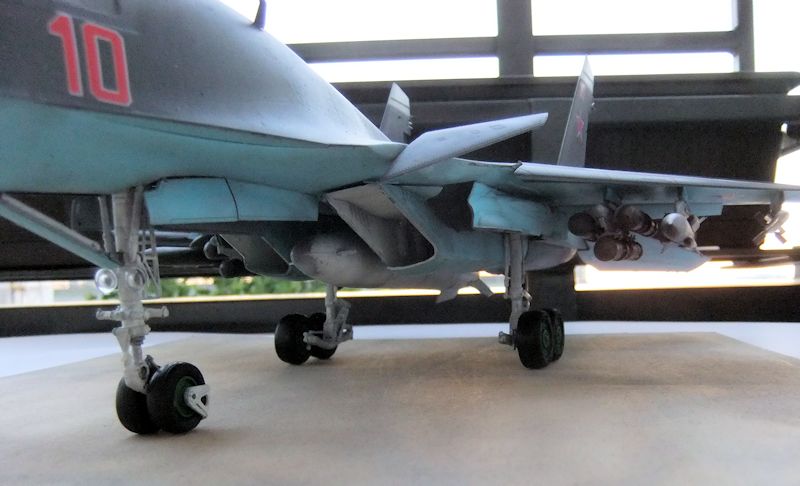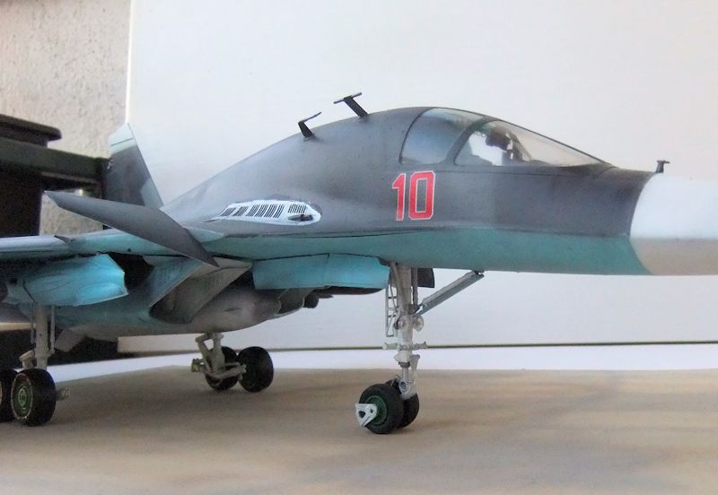 Danach werden die beiden unteren Lufteinläufe zusammengesetzt, mit Details versehen und mit den hinteren schon fertig ausgeformten Triebwerkverkleidungen verbunden. Bitte alles genau ausrichten. Die seitlichen Klappen wurden leicht angestellt. Nun geht es ans Fahrwerk. Die Fahrwerksstreben werden alle um stabile Metallstangen gelegt. Diese geben die nötige Festigkeit, um das schwere Modell überhaupt zu halten. Eine sorgfältige Ausrichtung der Fahrwerksbeine ist unerlässlich damit die Tandemräder des Hauptfahrwerks gerade auf der Platte stehen. Sonst tanzt die Su-34 unweigerlich "Tango". Auch die beiden Räder des Bugfahrwerkes verlangen diese Aufmerksamkeit. Leider bietet Hobbyboss nur "Gummiräder" an. Die Ausführung ist recht gut, aber schon nach ein paar Wochen sieht man auf den Stellflächen leichte Druckstellen. Bisher ist mir keine Alternative zu diesem Problem bekannt. In diesen Bauabschnitt gehört auch die Einstiegsleiter der Besatzung.