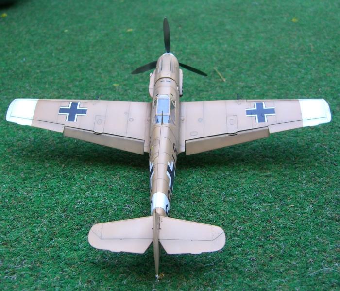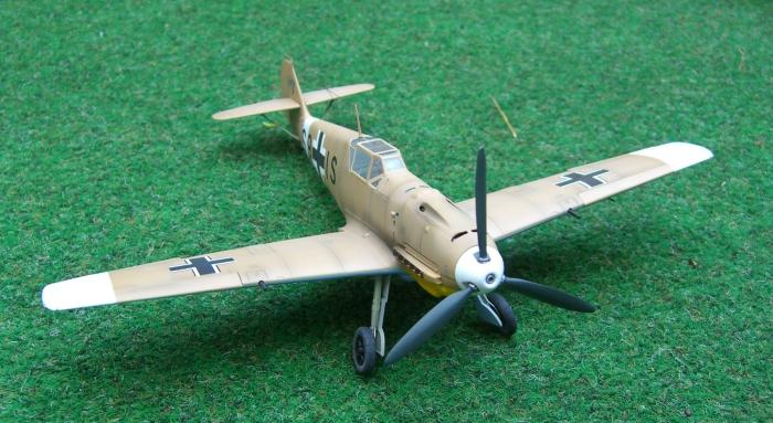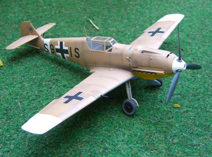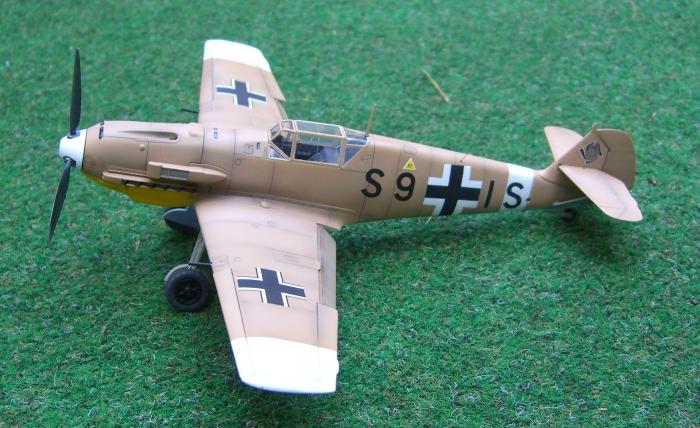 Zum Original: Im Spätsommer 1942 wurden einige Messerschmitt Bf 109 E-4/b (nach anderen Angaben E-7) der III. Gruppe (Jabo) des Zerstörergeschwaders 1 (später I./Schlachtgeschwader 2) nach Nordafrika verlegt, nachdem sie vorher in der Sowjetunion im Einsatz standen. Die Einheit flog unter zunehmenden Druck der Alliierten Fliegerkräfte taktische Unterstützungseinsätze für die Heerestruppen und musste dabei schwere Verluste hinnehmen. Entspreched viele Wracks waren dann auch auf dem Schlachtfeld zu finden. Einiger Schrott wurde fotografiert, so u.a. die S9+IS. Die Maschinen waren offensichtlich in den Farben 78/79 gehalten, wahrscheinlich wurde die ursprüngliche Standardtarnung übermalt. Die gelbe Motorunterseite ist nicht dokumentiert, aber nicht unwahrscheinlich (Flak-Warnung).