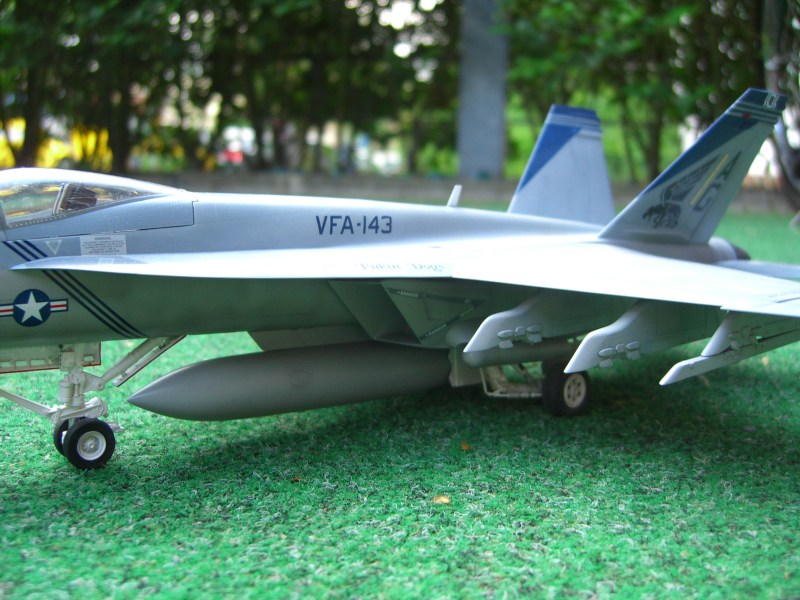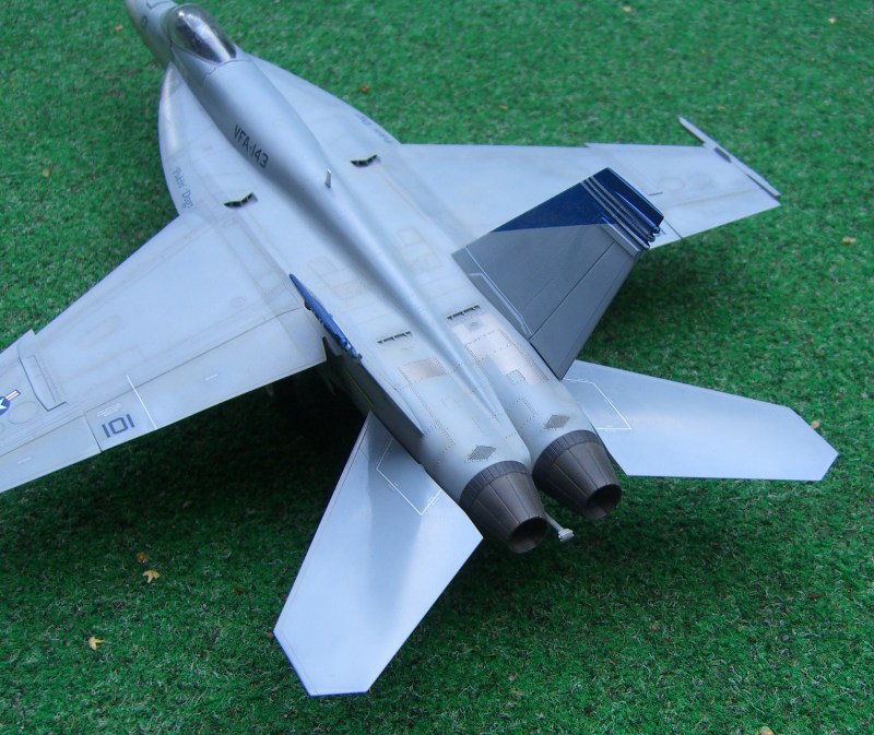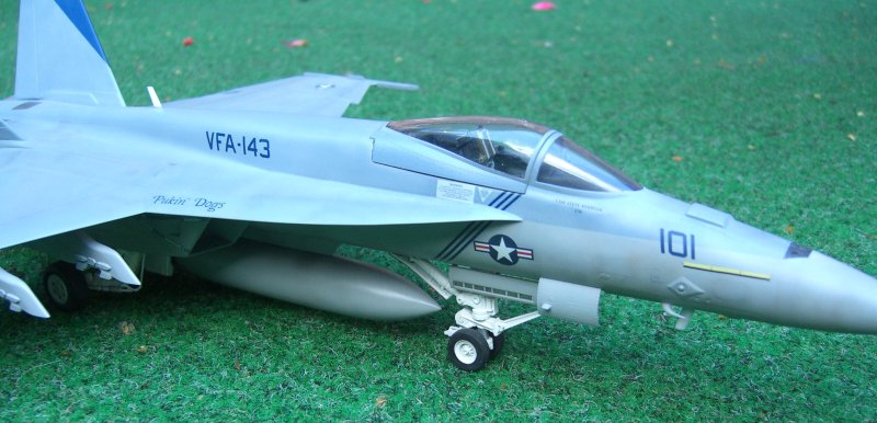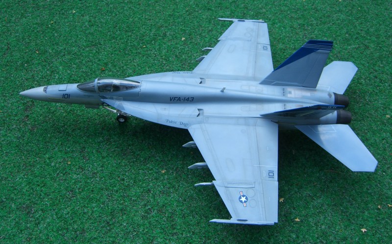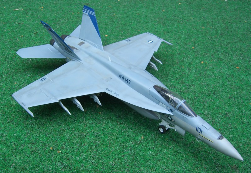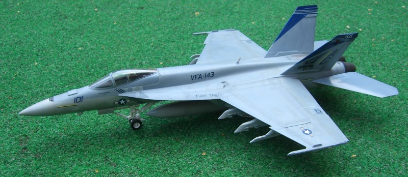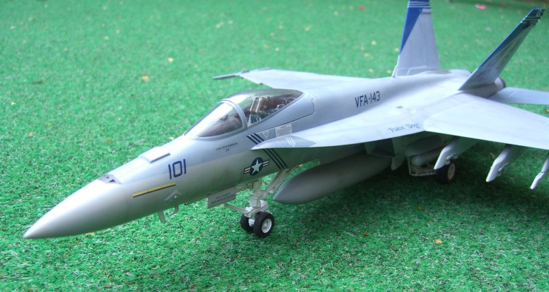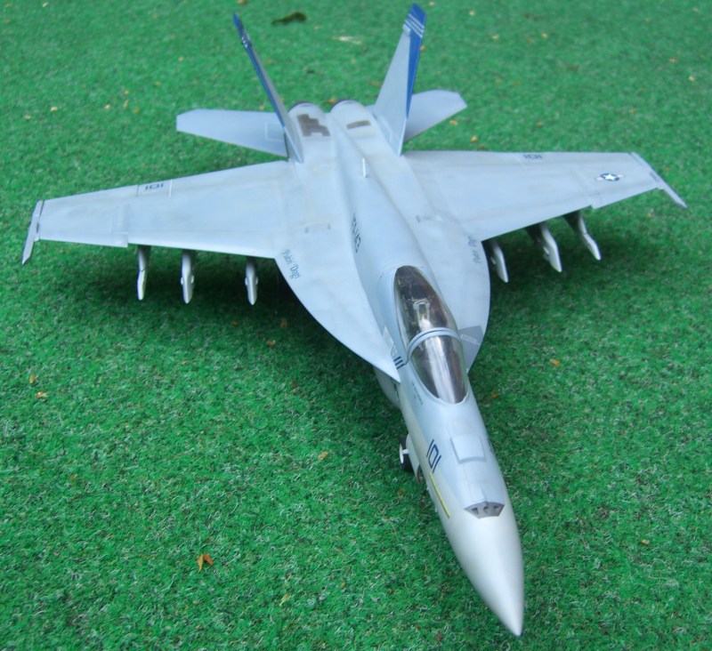 Vor zwei Jahren erschien dieses Modell der Super Hornet auf dem Markt, damals lange ersehnt und nach reichlich Problemen beim Formenbau endlich erschienen. Inzwischen ist auch die zweisitzige Variante erhältlich. Das Revell - Modell konkurriert mit dem Hasegawa Kit. Beide haben ihre Stärken und Schwächen. Beim Revell-Produkt gefällt die schöne Oberflächengestaltung und der kluge Breakdown. Wie bei der F-15 E bilden die Tragflügeloberseiten mit dem Rumpfoberteil ein Stück, und es gibt eine umfangreiche Auswahl von Außenlasten.
