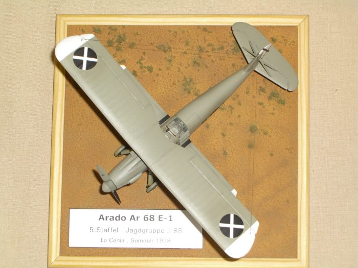 Modell: Meine Arado Ar-68 E-1 im Maßstab 1:72 besteht aus Komponenten verschiedener Bausätze: Rumpf und Leitwerk kommen von CMK, die Tragflächen von Huma und der Propeller von der Bf-109 B von Heller. Nach einigen Änderungen passten diese Komponenten recht ordentlich zueinander. Das Cockpit wurde etwa 5 mm nach hinten verlegt, bekam eine geöffnete Einstiegsklappe und wurde entsprechend ausgerüstet. Der Rumpf wurde neu graviert, bekam eine vernünftige Auspuffanlage und die charakteristischen versetzten MG-Läufe.