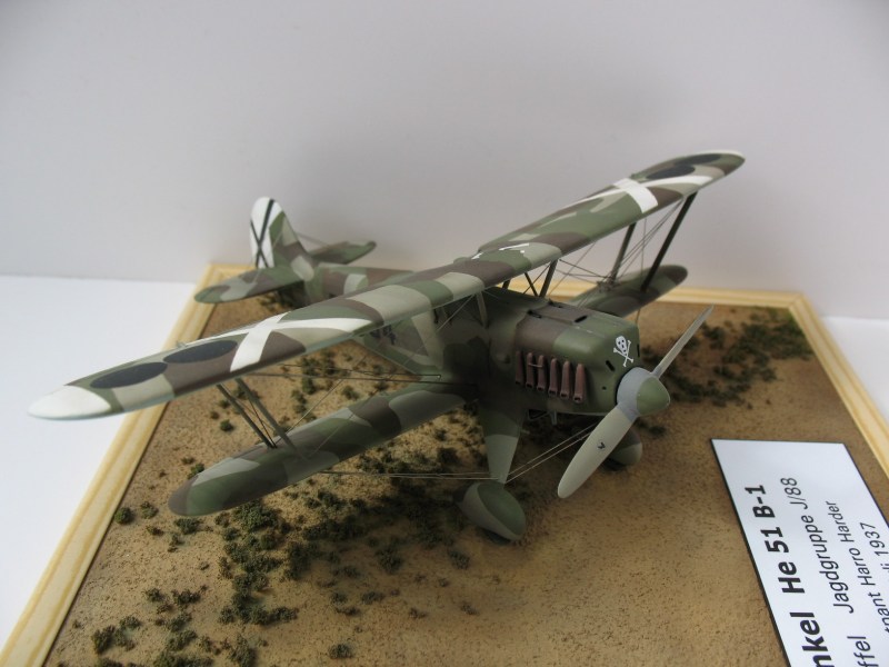 Vorbild: Ich habe mich für die Maschine 2-64 von Harro Harder, einem sichtbar fanatischen Anhänger des damaligen Regimes in Deutschland, entschieden, weil sie eine der bestfotografiertesten He 51 der damaligen Zeit ist und eine charakteristische Tarnung trägt. Zeitpunkt: Juli 1937 während der Schlacht um Brunete. Für die Bemalung verwendete ich Farben von Humbrol.