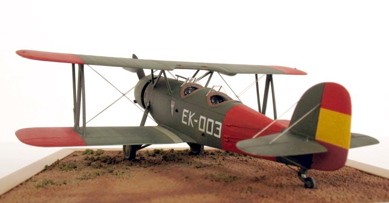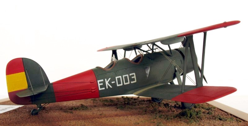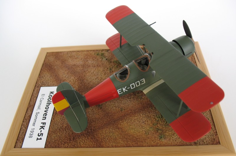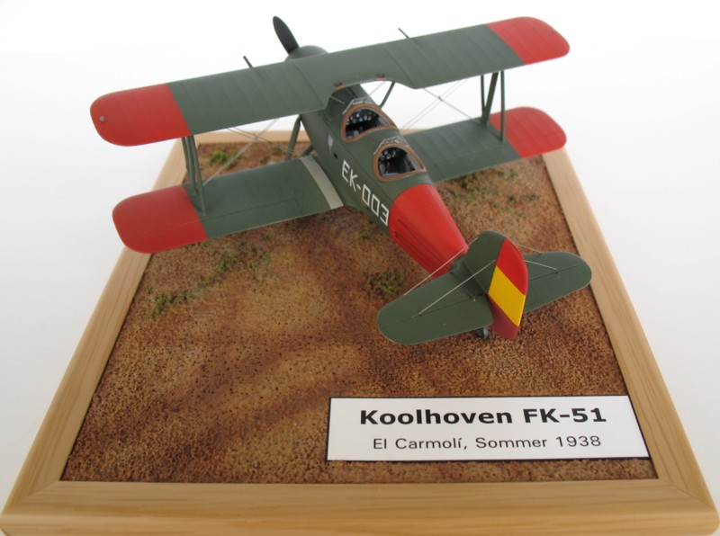 Von den insgesamt 28 Ende 1935, Anfang 1936 (vor Kriegsbeginn) bestellten Maschinen, wurden 22 FK-51 ab 1937 nach Spanien geliefert, von denen am Ende des Bürgerkrieges noch 4 Maschinen vorhanden waren. Die EK-003 (Ein Foto der im Bausatz dargestellten 002 kenne ich nicht.) war im Sommer 1938 in El Carmolí für die Nachtflugausbildung im Einsatz. Die Kennung dafür habe ich selbstgezeichnet und entsprechend ausdrucken lassen. Die Bemalung erfolgte mit Farben von HUMBROL