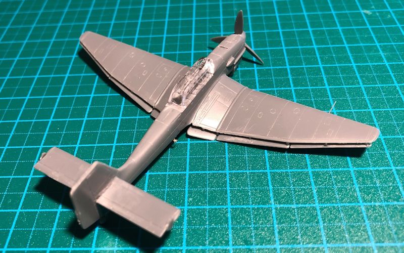 Es folgte als nächstes der Spinner, in dem die drei Propellerblätter problemlos eingeklebt werden konnten. Schwieriger erwies sich dann das Anbringen der Querruder hinten unter den Haupttragflächen. An den Tragflächen befinden sich kleine Zapfen, jedoch keine Aufnahmepunkte an den Querrudern. Das Ganze erwies sich dann als Geduldsspiel, denn sobald man das Flugzeug falsch in die Hände nimmt, bricht wieder das eine oder andere Querruder ab. Letztlich habe ich dann doch alles mit Superkleber fixieren können, wobei sich aber im weiteren Bauverlauf doch noch zweimal eines der Teile vom Flügel löste.