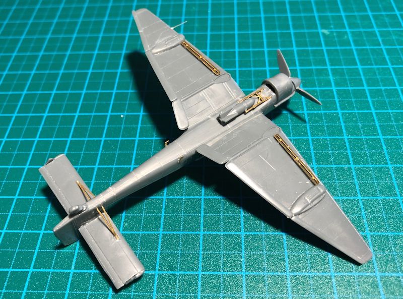 Die kleinen geätzten Luftbremsen unter den Flügeln erhielten von mir jeweils drei dünne Abstandshalter aus ausgestanztem Plastik um den korrekten Abstand zum Flügel sicher zu stellen. Danach wurde das Heckrad eingeklebt, was wiederum problemlos verlief. Die beiden Fahrwerksbeine mit Verkleidung wurden am Gussast belassen, um diese dort besser lackieren zu können: Damit konnte ich mir auch ein Abkleben bei der Bemalung ersparen.