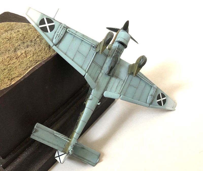 Nach einer gründlichen Reinigung mit Wasser erfolgten eine ganz leichte Grundierung und Betonung von Fugen und Vertiefungen mit dunkelgrauer Farbe/Primer von Vallejo, die mit der Airbrush aufgetragen wurde. Anschließend erfolgte das Aufbringen der weißen Flächen am Seitenleitwerk und den beiden Flügelspitzen. Nach dem Abkleben dieser Flächen folgte der Farbauftrag der Unterseiten in RLM 65. Die Flächen wurden wiederum abgeklebt wonach einige Bereiche in RLM 71 bemalt werden konnten. Nach weiterem Abkleben erfolgte entsprechend dem Tarnschema noch der Farbauftrag von RLM 70. Mittels Airbrush wurden für beide Farben noch Highlights gesetzt, die unter Verwendung der jeweiligen Grundfarben unter Zugabe von etwas weißer Farbe erhalten werden konnten. Schließlich wurden noch die Reifen und Auspuffzylinder farblich behandelt und dem Flugzeug eine ausreichende Zeit zum Trocknen gegönnt.