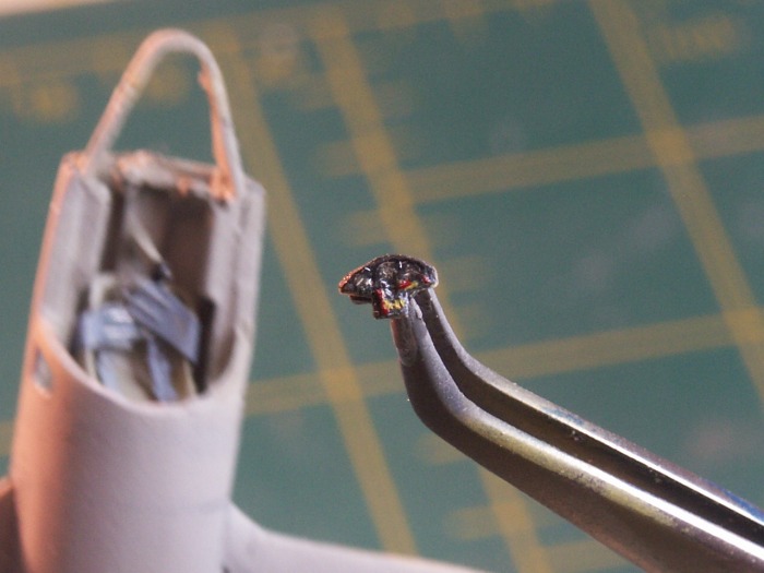 So auch wegen der "Gräben " am Rumpf, der auch Nacharbeit zur Darstellung des Spornrades braucht: Fotos und Risse zeigen dort nämlich statt des im Modell vorgesehenen Sporns ein veritables einziehbares Rad. Das kommt aus der Grabbelkiste. Der Rumpf wird aufgefräst, Klappen aus Alublech ergänzen den Fahrwerksschacht. Das Cockpit ist durch die großzügige Verglasung frei einsehbar: Sitzgurte und Pedale von Reheat werden ergänzt durch Konsolen, Schalter und Hebel des gleichen Herstellers. Das winzige Armaturenbrett ist mit Reheat Armaturen (Foto-Decals) versehen, die mit einem Tropfen Hochglanzlacks von dem sonst mattschwarzen Armaturenbrett abgesetzt sind. Die Rückseite liegt auch voll im Blick, also werden Instrumentengehäuse und Verkabelung aus Restbeständen gefertigt und angebracht.