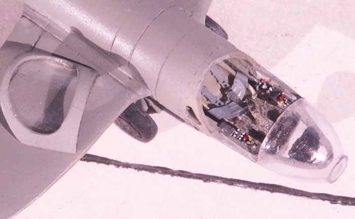 Die Kanzel oder besser der Bug passt vorzüglich und ist poliert und mit Future überzogen wirklich durchsichtig. Ein Scheibenrahmen wird durch dünnen Kupferdraht dargestellt, der mit Weißleim montiert ist, ebenso wie die Abtrennung für die Nase der Kuppel. Allerdings hat man dafür nur einen Versuch frei, also bitte eine ruhige Stunde vorsehen... Den Einbau des Dachfensters als Einzelteil kann ich mir nicht vorstellen: wie kommt der Pilot da hinein und auch wieder raus? Also habe ich das Kabinendach an der schrägen Gravur abgeschnitten und den hinteren Teil am Rumpf angeklebt. Unter den vorlackierten Rahmen wird flächendeckend eine 0,2 mm starke Acrylglasfolie geklebt und dann von unten der vom Rahmen abgedeckte Bereich matt lackiert. Es ist wie bei Segelflugzeugen aufgesetzt und wird in der gewählten Darstellung nur vom Monteur angehoben.