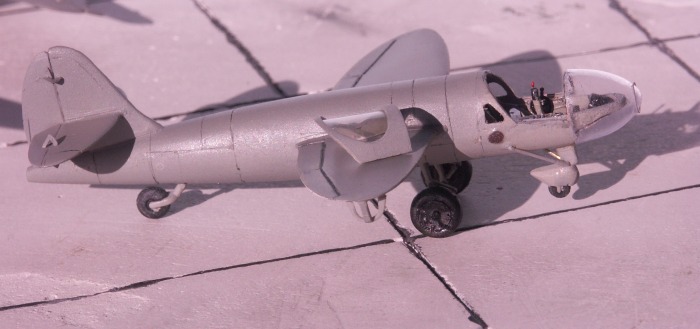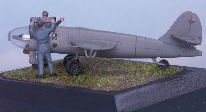 Das fertige Modell habe ich mit ModelMaster Möwengrau dunkel lackiert, Verschmutzungen bei dem brandneuen Gerät schien mir weniger angesagt! Sehr dezentes Trockenbürsten und Washing vor allem im Cockpit und am Fahrwerk zeigen gute Effekte.