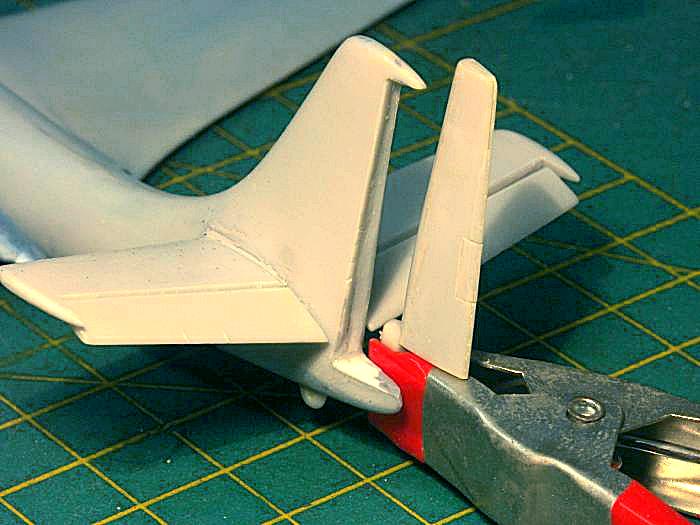 Die Ruder sind mit Skalpell und Rasierklingensäge herausgetrennt und werden mit Sheet am Gelenk aufgefüttert. Das Ganze eingeschlagen eingepasst wirkt lebendiger als die starre Nullage. Nicht vergessen auch die Trimmruder auszutrennen!
