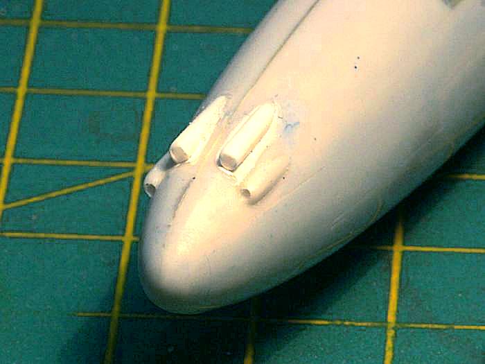 Die beiden mittleren Kanonen hat MPM vergessen: ein Stück Rohrprofil wird angepasst und mit Surfacer eingepasst.