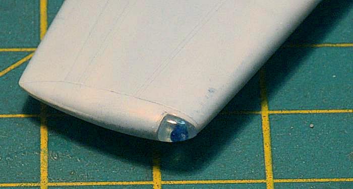 Positionsleuchten einfach aussägen und in die weiß oder silber lackierte Öffnung einen entsprechenden Gußast aus klarem Plastik einkleben. Zuvor wurde die "Leuchte" ausgebohrt und mit einem Tropfen Farbe gefüllt. Wenn das getrocknet ist, wird mit immer feinerem Schleifpapier verschliffen, bis es durch Micromesh endbehandelt richtig glänzt.