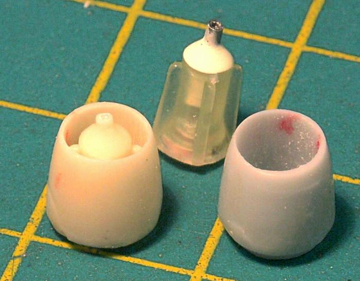 Die Kanzel soll offen dargestellt werden: Die bei MPM typische tiefgezogene Haube wird auseinandergeschnitten oder besser gesägt - mir hilft eine Rasierklingensäge dabei am Besten. Und wer vermeiden möchte, dass bei der Bearbeitung der einzigen beigefügten Haube etwas schief geht, braucht sie nur abzugießen zur Anfertigung eventuell notwendiger Kopien, dann klappt alles beim ersten Mal...