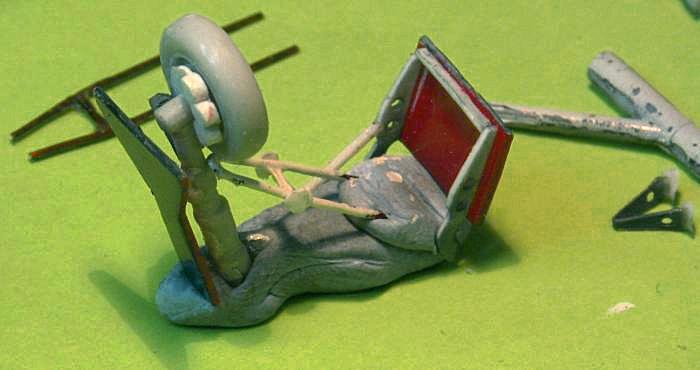 Das Fahrwerk erhält aus Draht die korrekten doppelten Einzugsstreben. Die Klappen werden mit Profil aus Sheet und Beschlägen aus Ätzteilresten versehen. Die unklare Quellenlage ist dabei nicht wirklich hilfreich, man muss sich für eine Darstellung entscheiden: ich habe einfach zeitgenössische Daten bevorzugt und die restaurierten Museumsflugzeuge negiert - wahrscheinlich ist beides irgendwann korrekt.