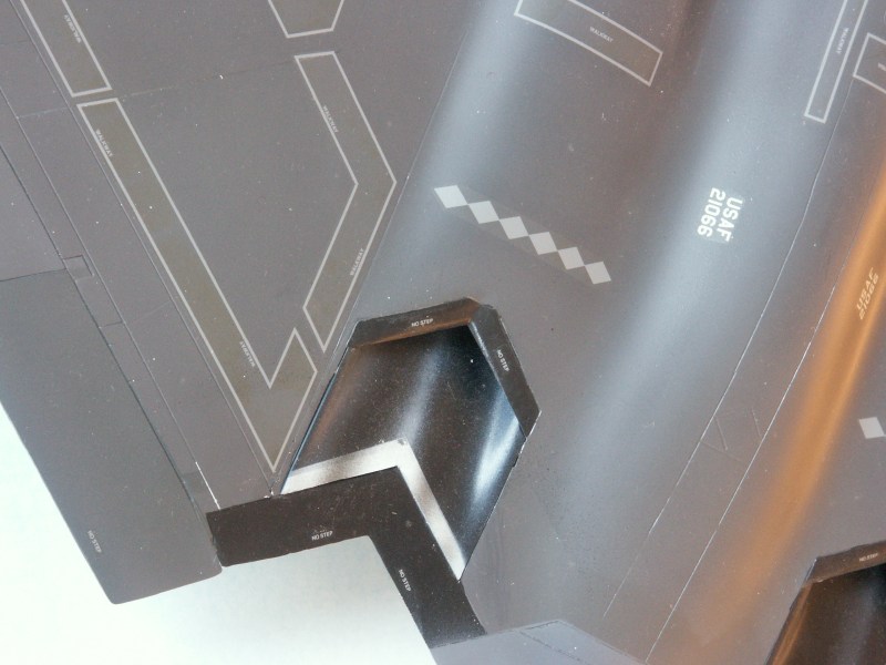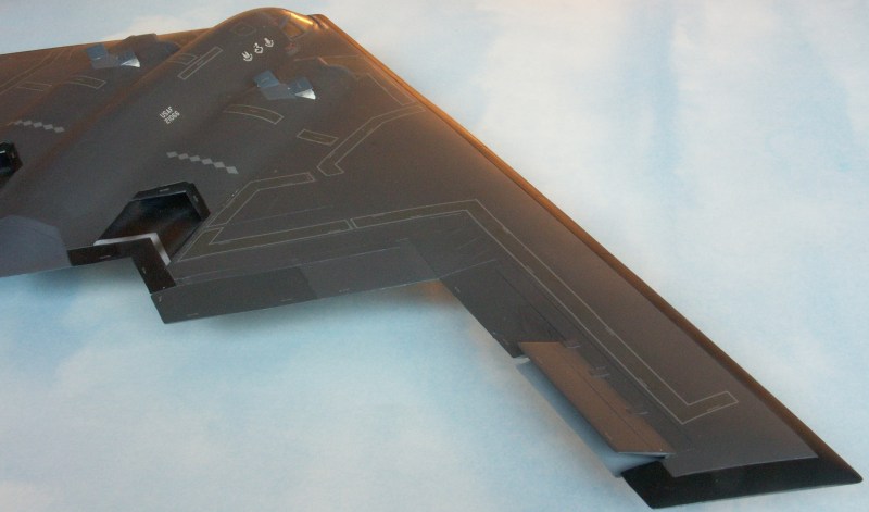 Der Rumpf (was ist Rumpf, was ist Tragfläche?) besteht jeweils für Ober- und Unterseite aus Mittelteil und den beiden "Flügeln". Nach der Gravur des riesigen Flugzeugkörpers (die Radar-abweisende Oberfläche ist fast völlig frei von harten Übergängen, also deutlich anders als im Kit vorgesehen) geschieht der Zusammenbau nicht gemäß Bauanleitung.