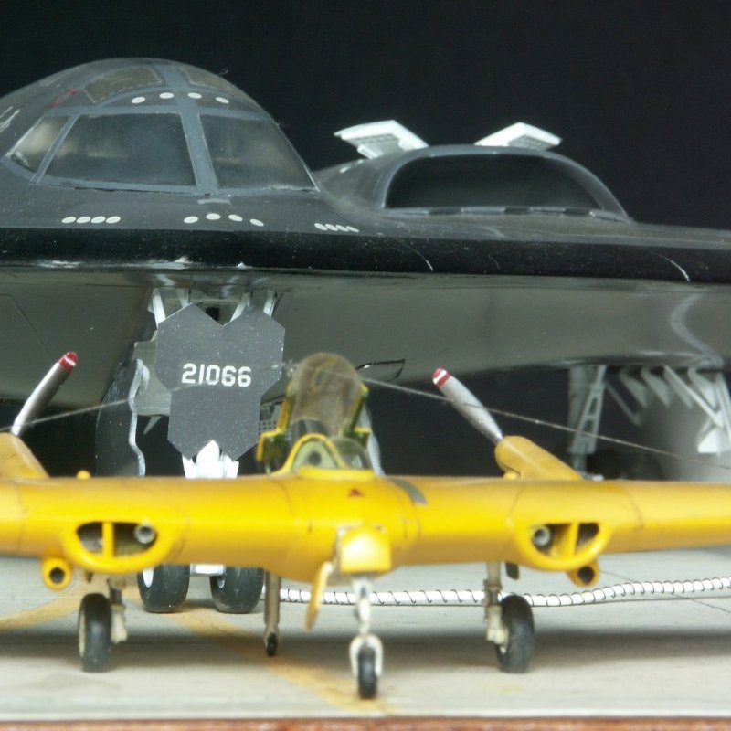 Darstellung Es gibt tatsächlich ein Foto in World Airpower Vol. 31 auf Seite 78, dass die Spirit im Februar 1995 mit der davor geparkten gerade in Chino in flugfähigen Zustand restaurierten N-9MB zeigt. Werte Nietenzähler, verzeiht mir, dass ich der Versuchung nicht widerstehen konnte, gerade das nachzustellen, obwohl der Sword Bausatz ja die N-9M darstellt, die freilich deutlich andere Lufteinläufe neben diversen anderen Unterschieden aufweist. Der große graue Geist wird durch den gelben Prototyp deutlich "sichtbarer": So lässt sich die Geschichte der Northrop Nurflügler nahezu authentisch darstellen, sicher auch für die meisten Interessenten irgendwie griffiger als nur die große B-2A!