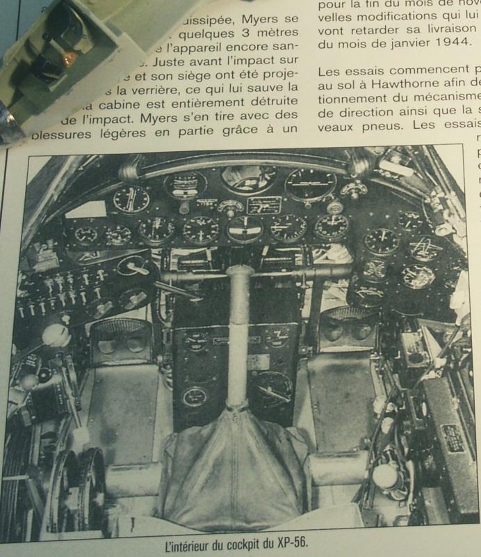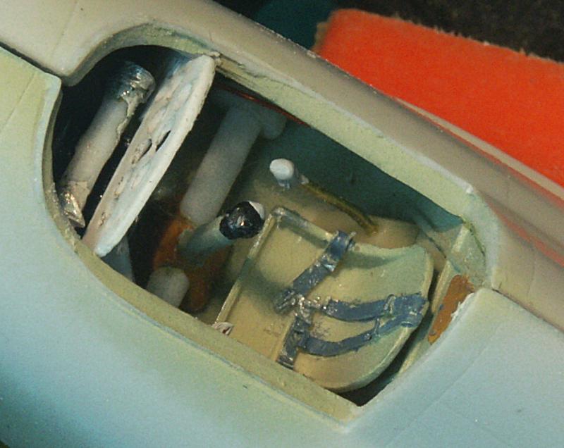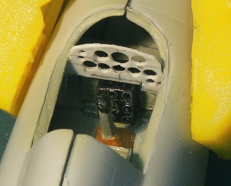 So entstanden nach und nach ein neuer Sitz mit Gurten, die Welle für die Ruderseile mit ihren Seiltrommeln, Pedalerie, Seitenkonsolen mit Gas- und Propellerverstellhebeln und schließlich das am Original orientierte Armaturenbrett. Eine prima Vorlage dazu liefert die Dokumentation zur XP-56 in AirMagazine No. 6. Wenn man die Armaturenabdeckung schön dünn und konturgerecht schleift, passt die auch noch drauf und gibt so eine gute Orientierung für die Position des Armaturenbretts.