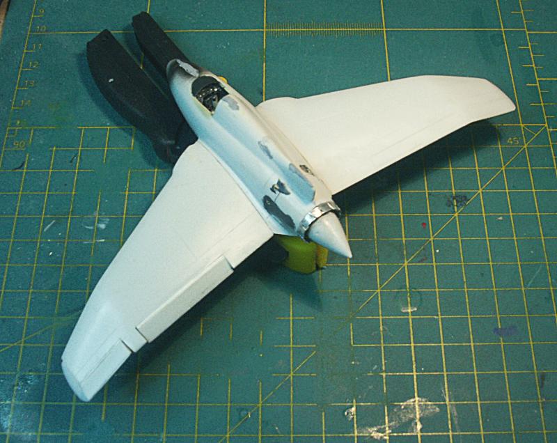 Die Flächen sind ziemlich massiv, die "Kühlergrills" aus Resin passen haargenau, ragen aber ein wenig in die Innenkontur hinein - das ist die Montagefläche zum Rumpf: am Besten bereits vorher abtrennen. Auch bei den Fahrwerksschächten darf diese Montagefläche nicht überschritten werden, sonst wird's nichts mit der erholsamen Endmontage. Mein Vorbild hat keck eingeschlagene Ruder: also die Klappen raussägen, im vorderen Bereich je nach Einschlag mit Evergreen Profil auffüttern und bis zur Endmontage weglegen.