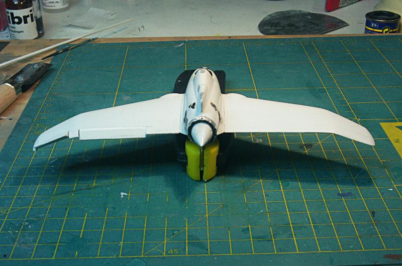Die Lackierung ist gerade bei diesem Flugzeug eine wichtige Entscheidung: Mit kurzer Rückenflosse und ohne Spreizklappen und deren Betätigung ist es der erste Prototyp, das ist schon mal klar. Der war aber bis kurz vor dem Erstflug lackiert. Warum dann die Farbe zum Erstflug runter musste, wissen wohl nur wenige Eingeweihte, jedenfalls zeigen alle Bilder das Flugzeug im Erstflug nackt.