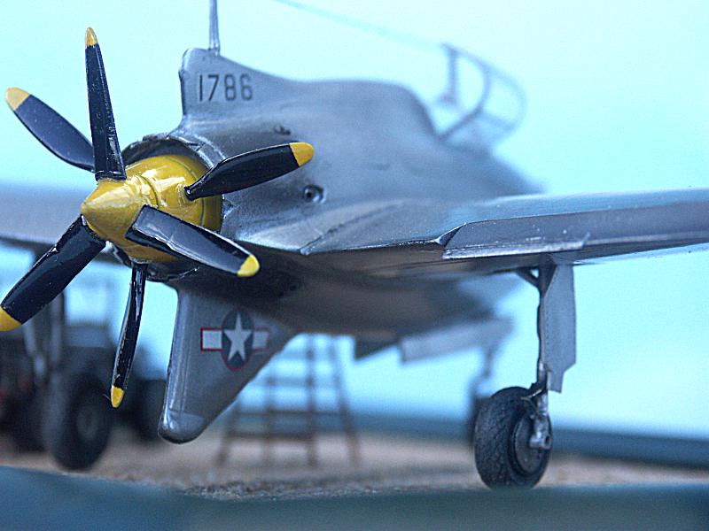 Den Rumpfabschluß bilden die Entlüftungsklappen des Motorraums und der gegenläufige Propeller. Die Nabe kann man auch in 2 Teile sägen und so die beiden Hälften gegeneinander verdrehen, damit die Propellerblätter nicht so steif ausgerichtet aussehen. Die Entlüftungsklappen habe ich abgeschnitten, einen passenden Drahtring statt dessen am Heck montiert und dann kleine vorgeformte Blechteile einzeln außen und innen aufgeklebt, denn auf meinen Vorlagen waren die Klappen immer offen...