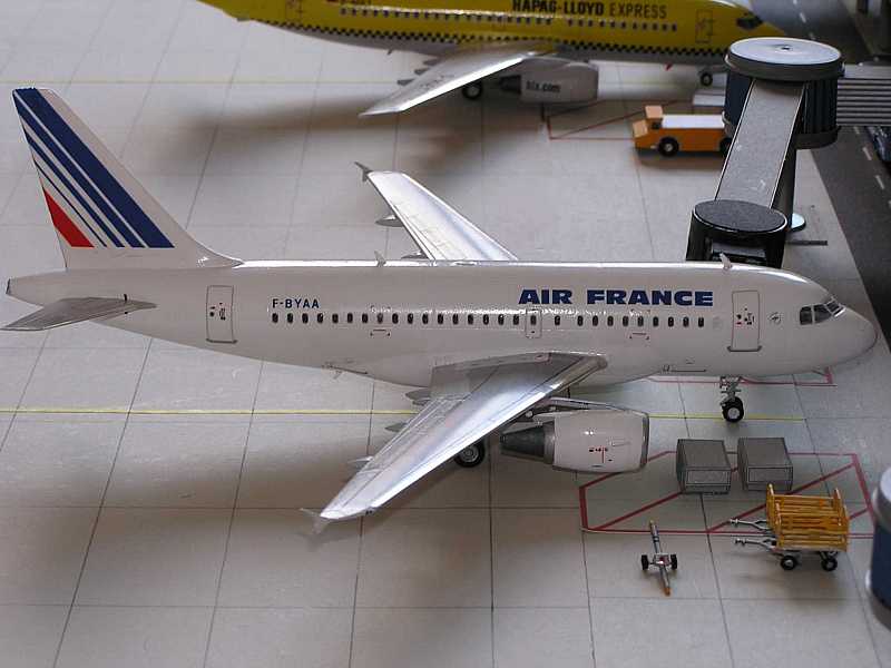 Während man den A 319 aus der Kiste bauen kann wie er kommt, musste für die A 318 einiges verändert werden. Der Rumpf des A318 ist vor und hinter der Tragfläche je 2 Spanten kürzer, das heißt zwei Fenster jeweils mussten herausgesägt werden. Weiterhin wurde das Leitwerk erhöht, um etwa 6 mm. Auch die Frachtraumtüren sind anders - also alle vorgefrästen Kerben dafür wegspachteln.
