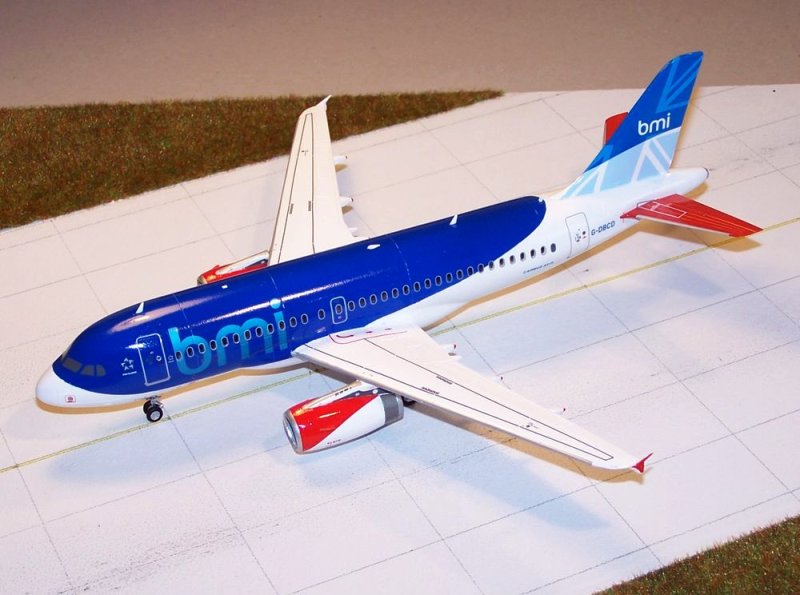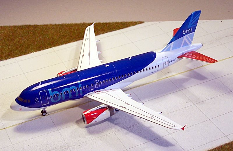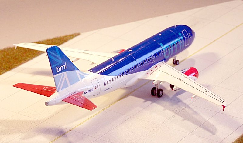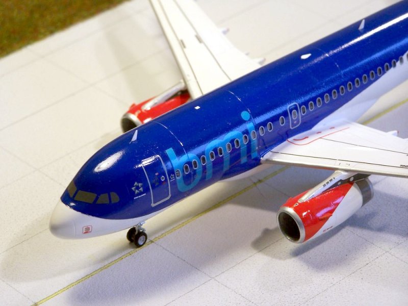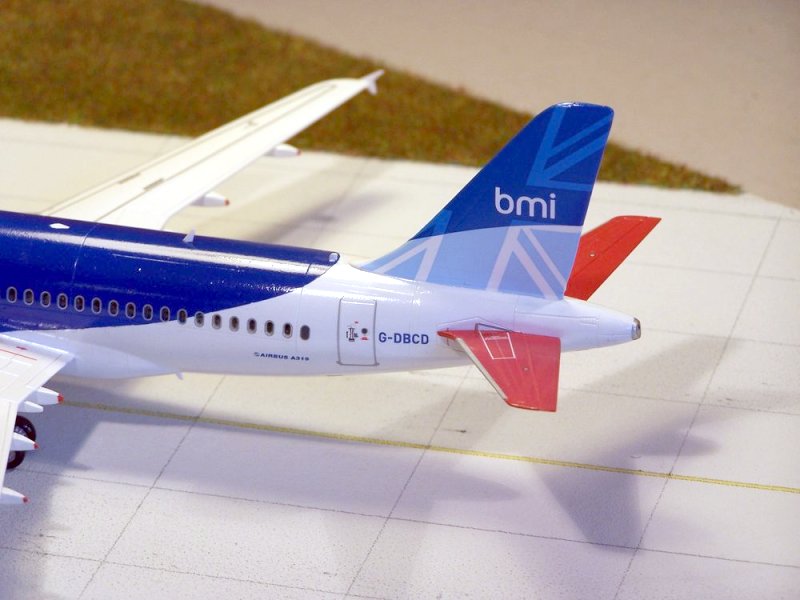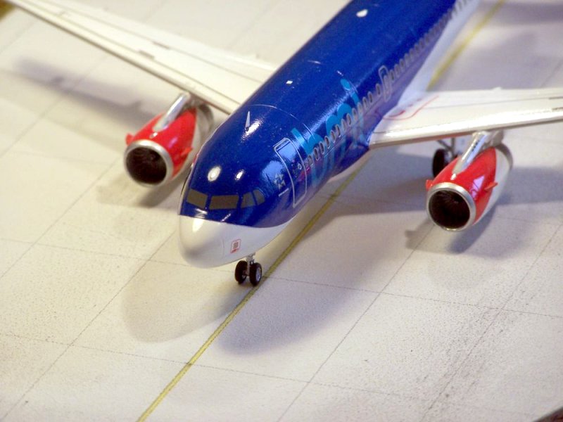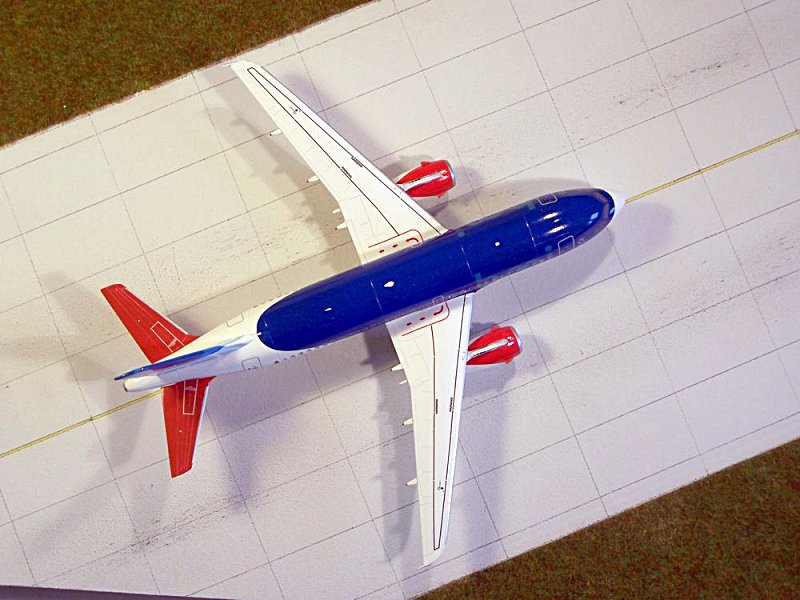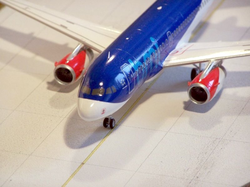 Die Farben Nach der Grundierung habe ich das gesamte Modell mit Revell 04 Weiß lackiert. Für die blaue Fläche an der Rumpfsoberseite habe ich mir eine Schablone mit Kurvenlinealen gebastelt, da die Form doch recht dreidimensional und anspruchsvoll ist. Die Farbe (laut Anleitung 2/3 Revell 51 und 1/3 Revell 52) passt meiner Meinung nach gut. Vielleicht einen Tick zu dunkel. Ich wurde aus den Bildern auf Airliners.net auch nicht so richtig schlau. Fakt ist aber, dass die Decalfarbe des Leitwerkdecals auf jeden Fall falsch ist. Schade im Zusammenspiel. Oder sollte man die Farbe dem Decal anpassen, dann stimmt eben alles nicht. Schwierige Entscheidung. Ich blieb beim "richtigen" Blau für die Rumpfsoberseite. Das Rot des Höhenleitwerke und der Details ist Revell 31.