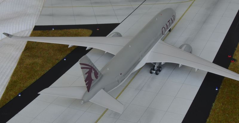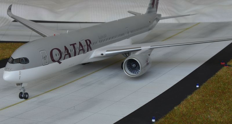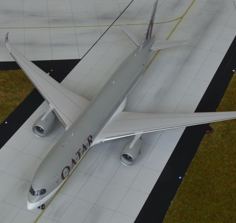 Persönliche Schlussbemerkung: Ein tolles, und gebaut auch imposantes Modell. Der Bau hat Spaß gemacht. Leider sind die sehr feinen Gravuren teils durch das Lackieren deutlich in den Hintergrund geraten. Schon Merkwürdig, bei der neuen E195 sind die Gravuren recht deutlich gepresst. Naja. Ist eben so. Die Form des Flugzeuges finde ich optisch gut getroffen, die Schnauze ist echt gut gelungen. Angekündigt ist ja schon die Lufthansa-Variante von Revell. Na hoffentlich führt Lufthansa im November, wenn es den ersten A350 bekommt, keine neue Bemalung ein!