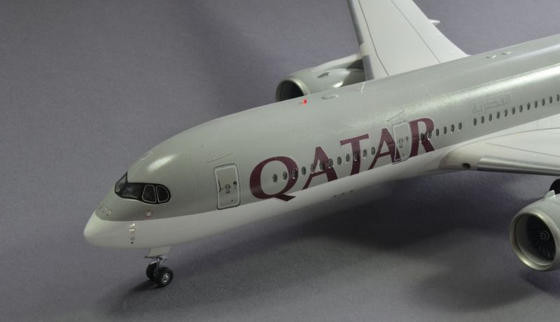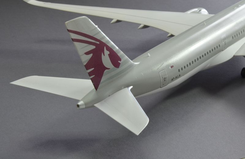 Farben und Decals: Der Rumpf der A350 wurde an der Unterseite mit Weiß X2 von Tamiya lackiert, die Tragflächen mit H338 von Gunze Mr.Hobby und ebenfalls von Gunze, eine Grau-Mischung aus H325 und H315 für die Rumpfoberseite und das Seitenleitwerk. Letzteres ist mir etwas zu dunkel geraten, denke ich. Aber es geht...