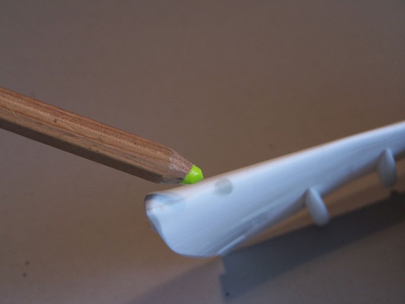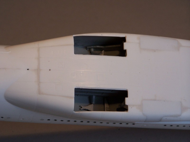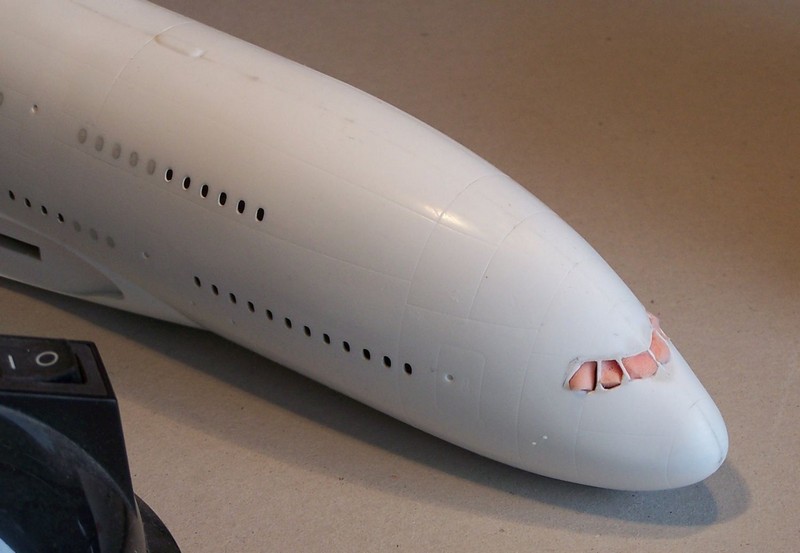 Jedenfalls bedeutet das ein bisschen Spachtelarbeit. Die Landelichter in der Flügelvorderkante am Rumpfansatz und leider auch das Cockpitfenster sind die Minimalveränderungen, die durchgeführt werden müssen. Das Cockpit folgt der ursprünglichen Gestaltung, so dass ich mich entschied, das Cockpit anzupassen und mit „Clear-Fix“ ausfüllen, statt das Decal zu benutzen. Das APU-Rohr ist zu vergrößern und die Stellung aller Fahrwerkschachtklappen muss nach Originalbildern angepasst werden. Auf gar keinen Fall die Bauanleitung zu Rate ziehen. Bloß nicht!