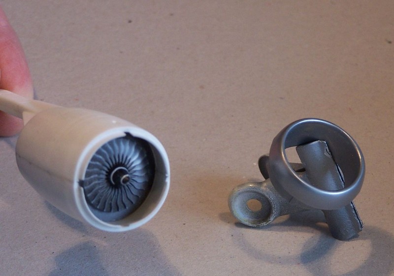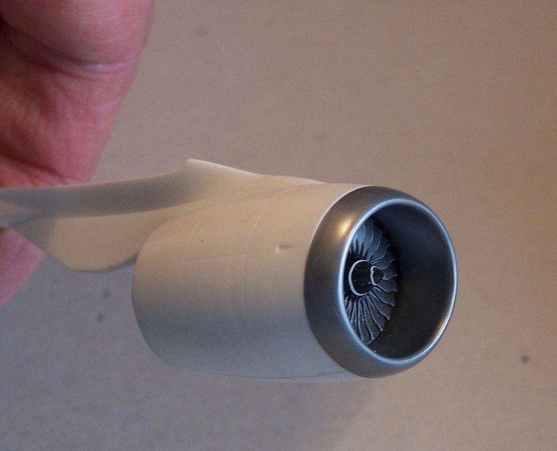 Auch die Treibwerke sind schön gestaltet. Das vordere Segment ist ein einziges Stück, so dass am Einlauf keine Nähte aufwendig innenseitig zu spachteln sind. Leicht einzufügen, dachte ich. Aber leider ist das Segment insgesamt breiter als der spätere Chromrahmen, so dass er nun doch außen eingespachtelt und nachgraviert werden muss.