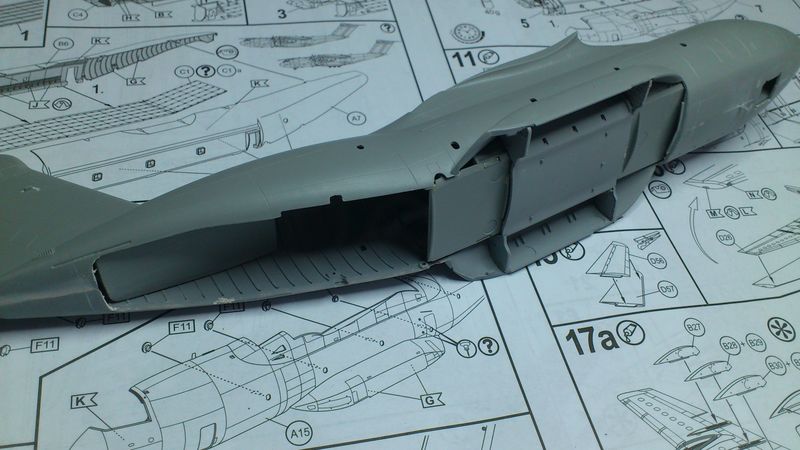 Lustig werden die Stützbeine bei ausgefahrener Rampe (Teil Nr.E77). Die soll man durch ein Loch an der Rumpfunterseite durchschieben und innerhalb des Laderaumes an einem vorgesehenen Punkt befestigen. Leider passt der Andocknuckel nicht durch das Loch im Rumpf. CAD und Wirklichkeit?