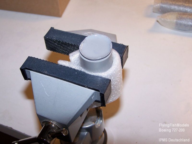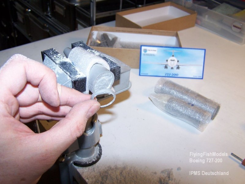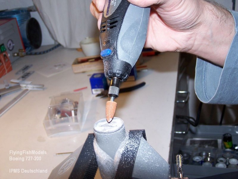 Zunächst müssen, wie bei allen Resinbausätzen, die Angüsse entfernt werden. Hierzu habe ich an den runden Bauteilen mit einer Modellfräse die Teile an den Stößen etwas ausgehöhlt, etwa 2-3 mm tiefer als der Ansatz herausragt. Dadurch bleibt vom Anguss nur ein Ring zurück, der sich sauber mit der Modellsäge, ebenfalls bei FlyingFish zu erwerben, abtrennen lässt. Nachdem alle Bauteile so vorbereitet wurden, passen die zurückgebliebenen Kleberänder perfekt aufeinander, wodurch sich insgesamt die Teile besser ausrichten und mit Superkleber zusammenfügen lassen. Ausrichten kann man die Teile perfekt an den Gravurlinien.