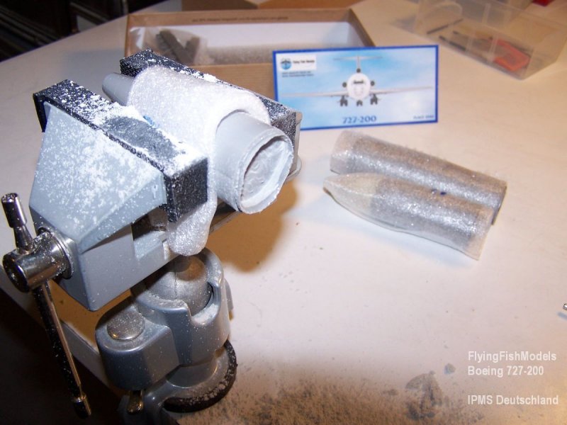 Da die Tragflächen, Höhenleitwerke und Triebwerke genau in die Klebeöffnungen passen und sauber am Rumpf abschließen, habe ich mich dazu entschieden, diese Teile separat fertigzustellen und erst nach dem Lackieren an den Rumpf anzukleben