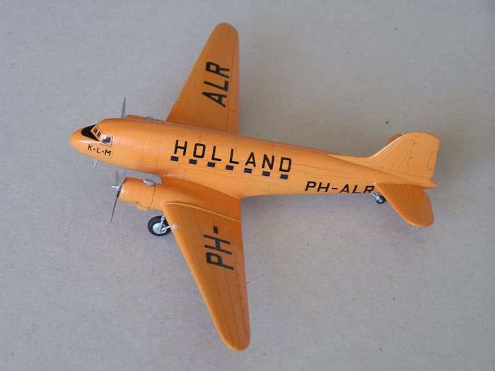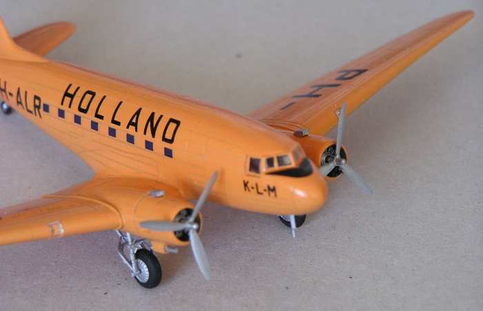 Ich habe mich für die Orange-Variante der KLM vom Ende der Vierziger Jahre entschieden. Sie macht sich nun gut neben der Silber-DC-2 mit den Orange-Beschriftungen. Die Farbe brachte ich in sehr verdünnten Lagen auf, das half durch den Verlaufeffekt die Struktur des Rumpfes deutlich hervorzuheben. Sicher im Maßstab gesehen etwas zu deutlich, aber dennoch recht effektvoll.