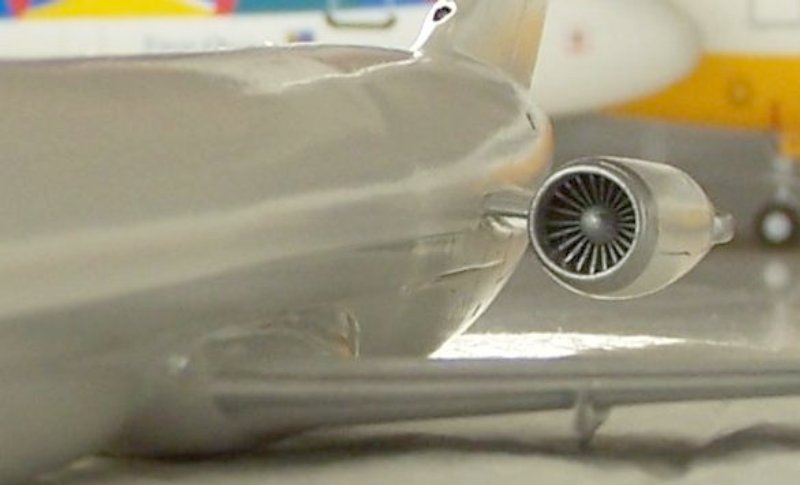 Ähnlich verfährt man mit den schön detaillierten Triebwerksteilen. Diese mit dem Rumpf zu verkleben erfordert ein bisschen nachmessen und Augenpeilung. Um sie exakt zu platzieren die etwas zu hoch angesetzte Führung auf der linken Rumpfseite ignorieren. Das Triebwerk ist korrekt platziert, wenn man es etwa 1,5 mm tiefer ansetzt. Wichtig, da die Fensterreihenstreifen der Bemalung in voller Breiter über der Triebwerksaufhängung verlaufen.
