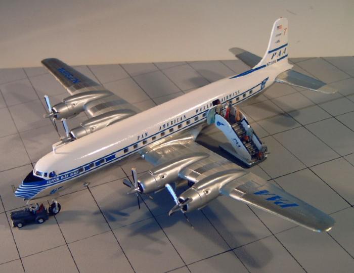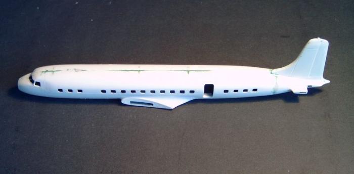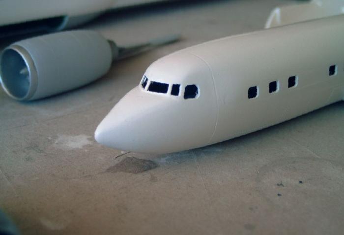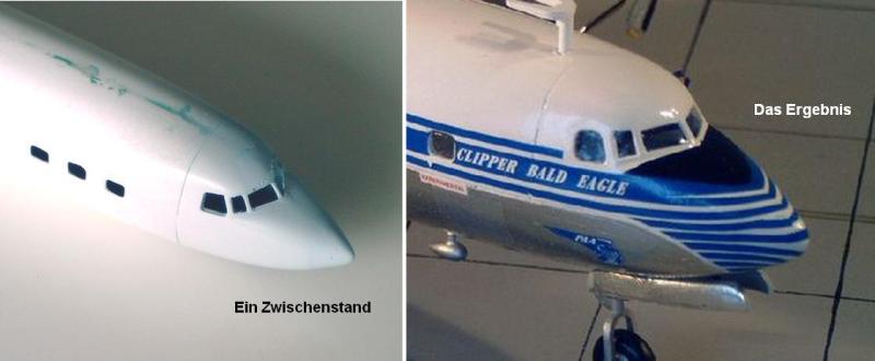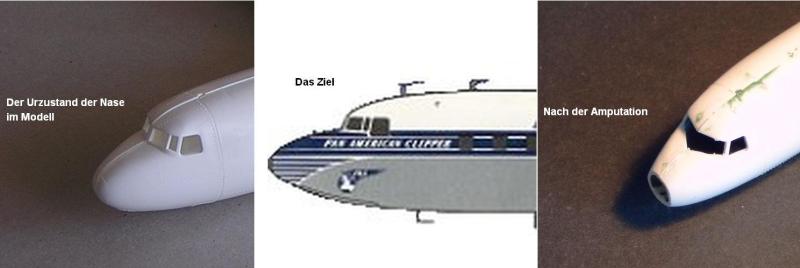 Um über dieses Ereignis hinaus auch optisch ein wenig DC-7C zu vermitteln ist ein bisschen mehr zu tun. Ich bin nicht DER Luftfahrtexperte und schon gar nicht DER Superperfektionist, aber zumindest die Schnauze und das Cockpitglas müssen verändert werden.