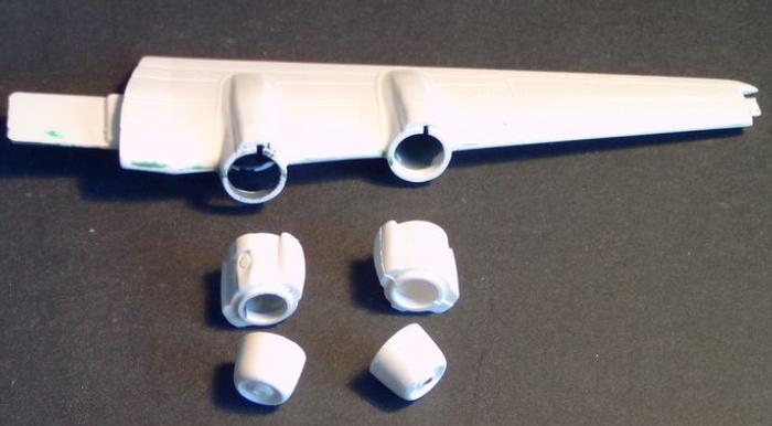 Da ich offene Fenster liebe begann mein erster Arbeitsgang damit, die nach hinten eingestanzten Fenster von hinten durch Zurückfeilen des Plastiks im Fensterbereich zu öffnen. Unerwarteter Weise ging dies ziemlich leicht und die Fenster öffneten sich fast von selbst. Und behielten auch eine scharfe Kante. Nachdem alle Innenseiten dunkel lackiert waren ging der Zusammenbau von Rumpf und Tragflächen flott. Tricky waren nur die Endstücke der Flügel, (warum hierfür ein Extrateil benötigt wird, weiß ich nicht) es muss ordentlich geschliffen und eingespachtelt werden.